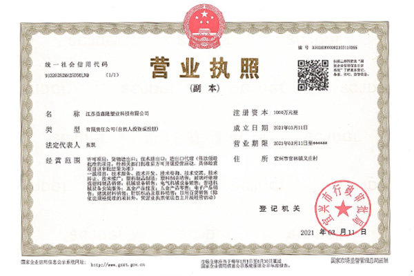 江苏益鑫隆塑业科技有限公司公司坐落于宜兴市官林镇义庄村,这里交通便利,地理位置优越。公司成立于2021年03月11日,是一支具有强大研发,生产,销售和服务的团队,拥有一批技术精湛的专业生产人才和眼界开阔的管理人才,实力雄厚。